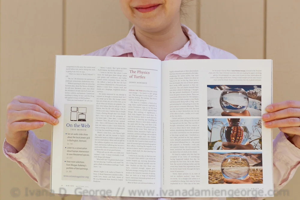 /I am happy to share that several photographs from the Glacial Waters series were selected to be featured in the Orion Magazine. This is a journal that explores environmental issues through poetry, prose, art and reporting. I had been intending to send them a press kit, but was pleasantly surprised when they found my website online first, and invited me to publish selected images from the Glacial Waters series.