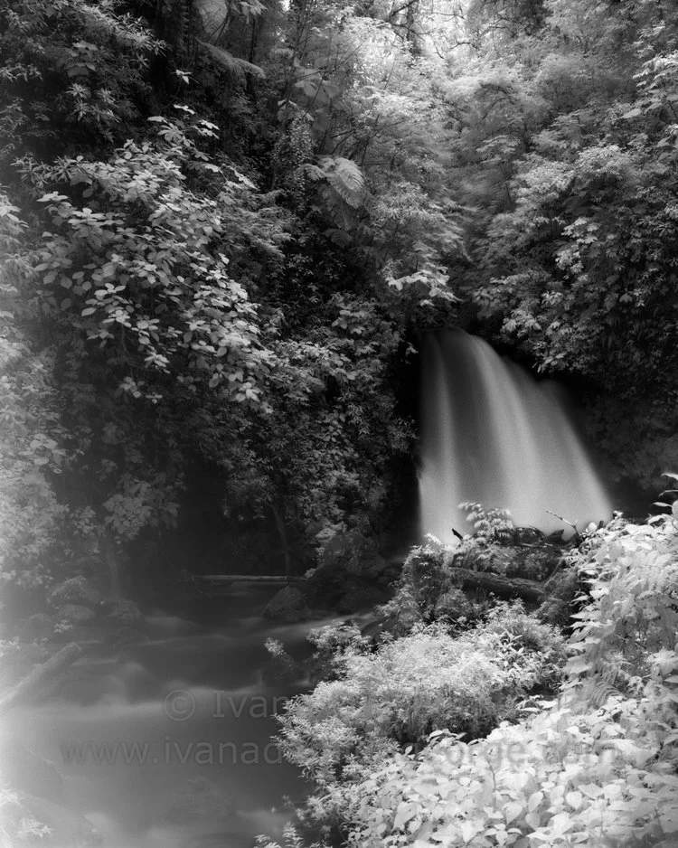 Halfway up the mountain we discovered a short side trail labeled with a sign that that read “Cascada” (waterfall in Spanish). Intrigued we followed the path. Upon arriving at the end we found a clearing in the forest where the sun could break through and a torrent of water was cascading down into a swirling pool. All around that pool were ferns and other plants taking advantage of the break in the forest canopy. I knew I had to capture this scene with the beautiful splendor of my infrared film and large format camera! The power of the water was churning the pool so mightily that that mist was rising up off the surface. The humidity, rain, and mist was constantly fogging my camera lens. Because I was shooting infrared on large format, there were many steps I had to take to prepare for each exposure including focusing, then adding the filter, connecting a shutter release cable, and finally making the photograph. It was nearly impossible to do all this and keep the mist from fogging my lens and filter. After attempting several times to set up my camera and clean the lens, I nearly gave up with frustration! I turned to my husband who had just returned to see if I was finished. I expressed my dismay about getting this shot. To my luck, my husband had previously purchased an anti-fog cloth for his glasses that did the trick for my lens and filter! When the image was finally developed, I was so excited. The mist coming off from the waterfall, I felt, made the shot even better because it captured the experience of witnessing Cerro Chato Cascada’s immense beauty.
